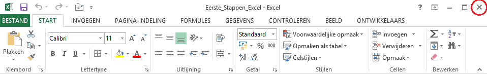 Het afsluiten van Excel is eenvoudig. Kies in het lint rechtsbovenaan voor het kruisje. Als je het huidige werkblad hebt opgeslagen zal Excel afgesloten worden. Als dit niet het geval is zal het programma nog vragen of je het bestand op wilt slaan.