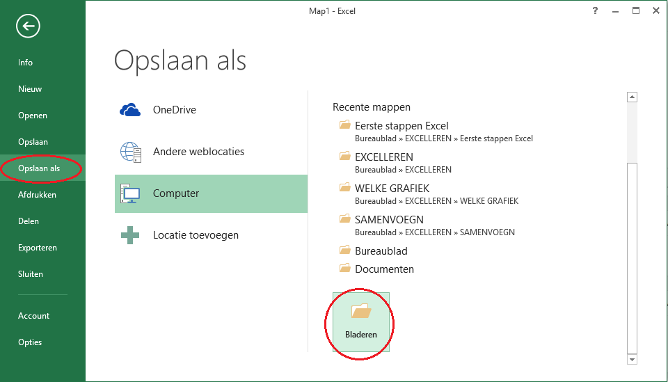 Door het gebruik van Opslaan als en vervolgens te kiezen voor Bladeren kun je zelf bepalen op welke locatie het excel bestand op de computer wordt opgeslagen en welke naam het bestand moet krijgen.